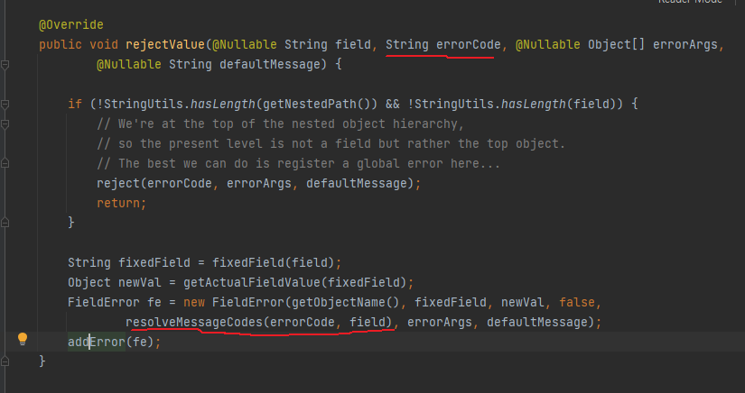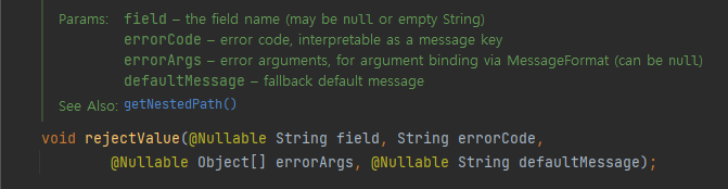 코드를 통해 알 수 있다시피 사실 rejectValue() 는 new FieldError() 인스턴스를 만들어서 직접 에러를 등록해주고 있다. 즉, rejectValue() 가 만들어주기 때문에 개발자가 직접 FieldError 를 만들필요가 없던것이다.