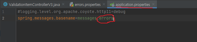 그 다음, application.properties 에 가서 매시지소스의 basename에 errors 를 추가해줘야한다.