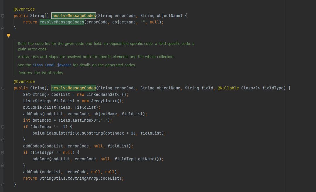 resolveMessageCodes() 는 두 종류로 오버로딩이 되어있음을 확인할 수 있다.