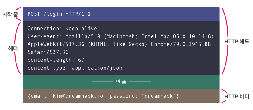 CRLF : CRLF는 Carriage Return (CR)과 Line Feed (LF)의 조합을 나타낸다. CR과 CF는 주로 텍스트 파일에서 줄 바꿈을 나타내는 데 사용하는 제어 문자열이다. 윈도우 운영체제에서는 줄을 종결하기 위해 CRLF를 사용하고, 리눅스 같은 유닉스 기반 운영체제에서는 LF만을 사용한다.Carriage Return (CR) : 커서를 현재 줄의 맨 앞으로 이동시키는 문자Line Feed (LF) : 커서를 다음 줄로 이동시키는 문자시작 줄의 역할은 요청과 응답에서 큰 차이가 있기에 뒤에서 기술하도록 하겠다. 헤더는 필드와 값으로 구성되며 HTTP 메시지 또는 바디의 속성을 나타낸다. 하나의 HTTP 메시지에는 0개 이상의 헤더가 있을 수 있다.