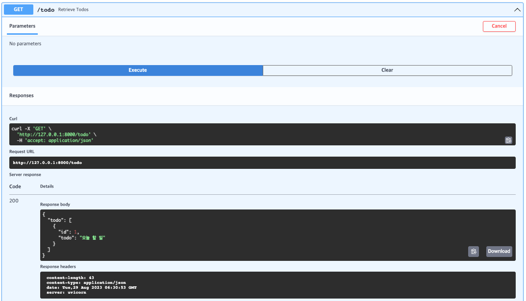 GET 메서드를 통해 POST 메서드를 통해 추가한 todo를 확인할 수 있다.
