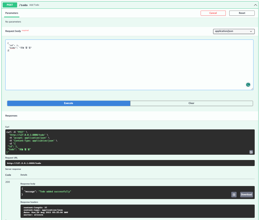 위 홈페이지에서 Try It Out > Execute 버튼을 누르면 API가 호출되고 결과 값을 확인해 볼 수 있다. Request Body에 알맞은 형식의 데이터를 아래와 같이 입력하면 todo가 추가된다.