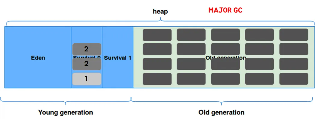 VM의 Heap은 크게 Young Generation과 Old Generation으로 나뉜다. 전자에서 발생하는 GC는 minor gc, 후자에서 발하는 GC는 major gc(full gc)라고 부른다.
