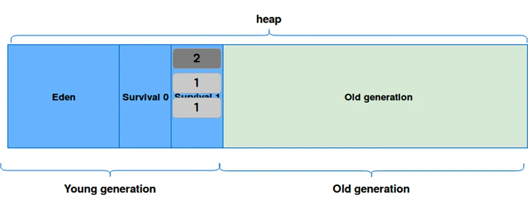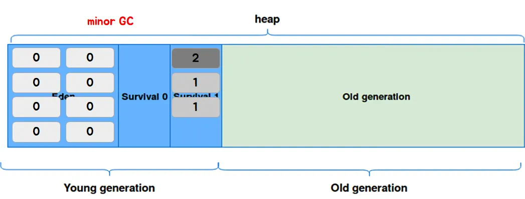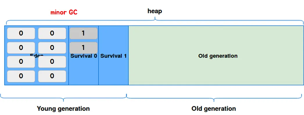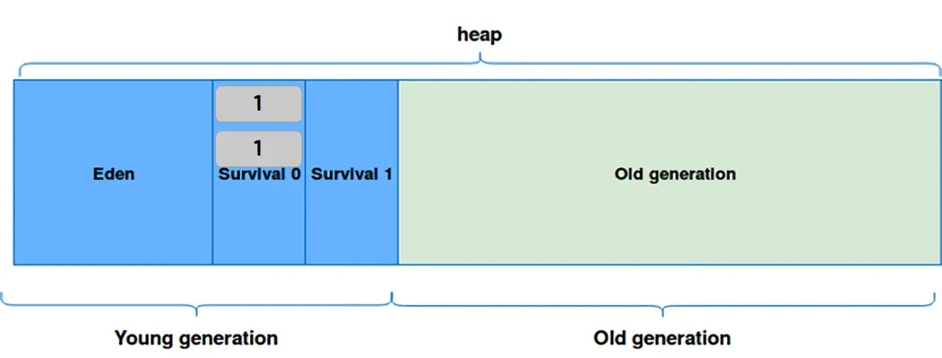 Young Generation은 또 다시 Eden, Survival 0, Survival 1 영역으로 나뉜다. Eden은 새롭게 생성된 객체들이 할당되는 영역이고, Survival 영역은 minor gc에서 살아남은 객체들이 존재하는 영역이다. 이때 Survival 영역에서 Survival 0과 Survival 1 중 하나는 꼭 비어 있어야 한다는 규칙이 있다.