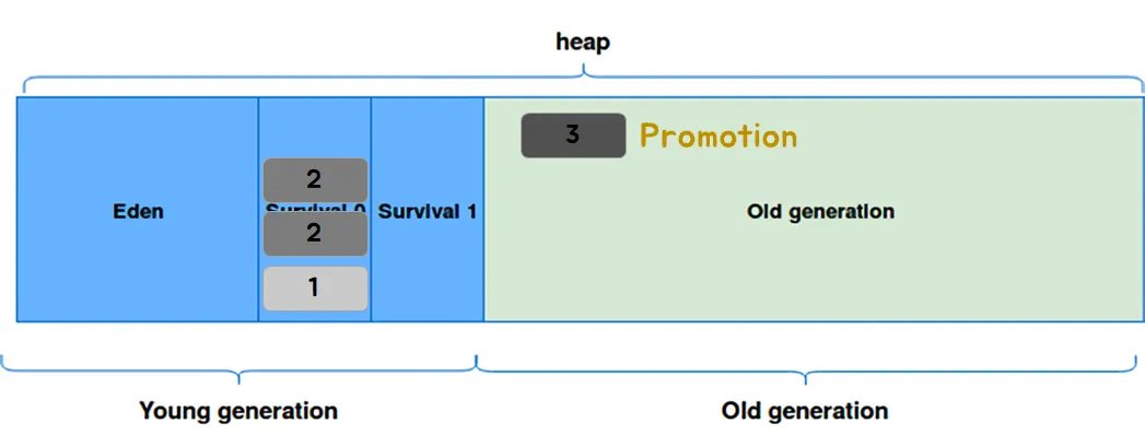 JVM GC에서는 일정 수준의 age bit를 넘어가면 오래도록 참조될 객체라고 판단하고, 해당 객체를 Old Generation에 넘겨 주는데, 이를 Promotion이라 부른다.