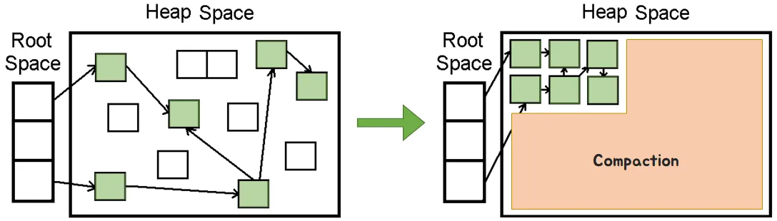 그림에서는 Sweep 이후에 분산되어 있던 던 메모리가 예쁘게 정리된 것을 볼 수 있는데, 이것은 메모리 파편화를 방지하는 Compaction 과정이다. 다만, Mark And Sweep 알고리즘에서 Compaction이 필수는 아니다.