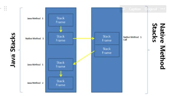 - JVM 스택과 네이티브 스택이 나뉘어져 있다 하더라도 자바 코드를 수행하다 JNI를 호출하면, JVM 스택에서 네이티브 메소드 스택으로 확장할 뿐이다.