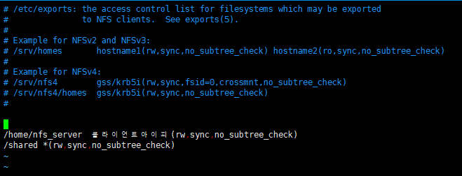 -- no_subtree_check: 클라이언트가 작업한 내용에 대해 무결성 검사를 하는 하위 트리 검사를 수행하지 않는다.