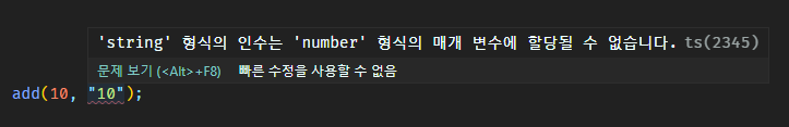 하지만 ts의 add 함수의 경우, 변수의 자리에 문자열타입의 값을 넣게 되면 애초부터 빨간줄로 에러를 알려주게 된다.