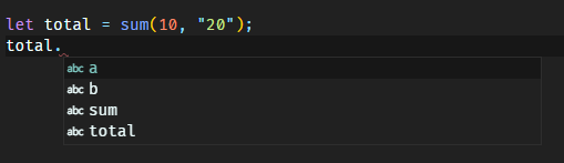 js의 sum함수의 리턴값을 total이라는 변수에 할당했을 때, total의 자동완성 메서드는 아무것도 뜨지 않으며 실수로 변수의 메서드에 오타를 내도 에러를 나타내지 않는다.
