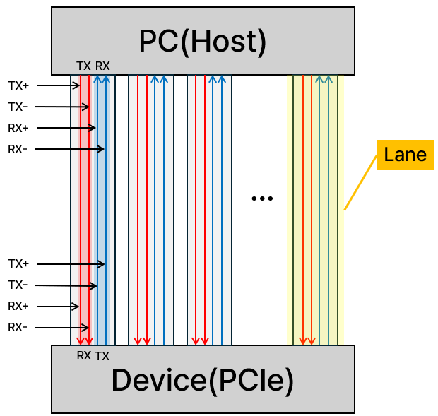 하나의 차동 쌍(Differential Pair)이라는 말이 나왔는데, 이 말은 위의 그림에서 볼 수 있듯이 TX pair와 RX pair를 의미한다. 하나의 Lane은 TX pair과 RX pair로 이루어져 있는데, TX는 송신, RX는 수신을 의미한다. 그러니까 PC의 TX와 RX가 각각 PCIe의 RX와 TX가 되는 것이다.