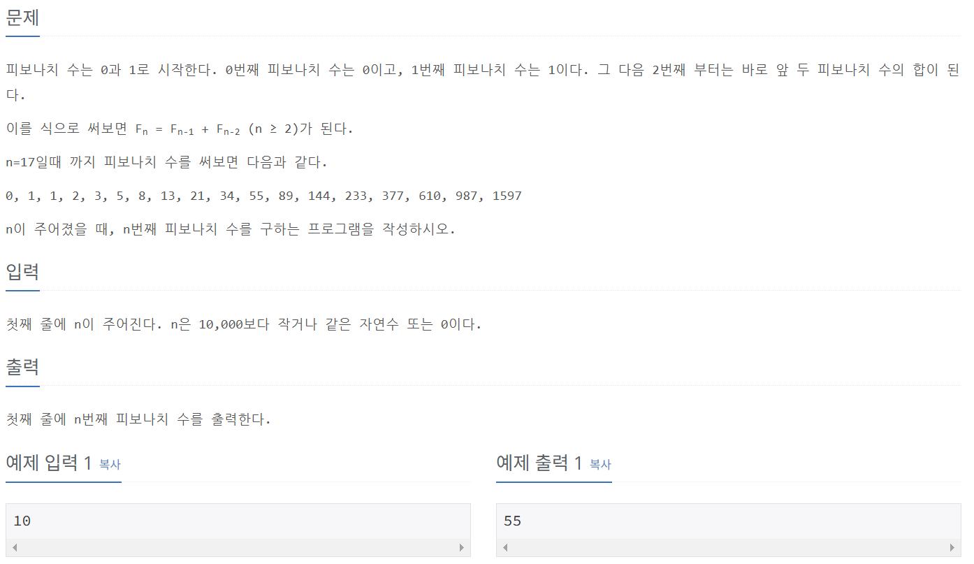 - n이 0도 가능 하기때문에 피보나치 수 0,1번째 입력함 (dp[0] = 0, dp[1] = 1)