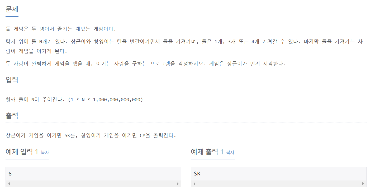 코드 설명 마지막의 돌을 가져가는 사람이 이기며 1,3,4개만 가져갈 수 있음 규칙을 찾아봤을때 N = 2,7,9,14,16,21,23 등일 경우 창영이가 승 즉 N을 7로 나눴을 때 나머지가 0 또는 2일 경우 창영이가 승이라는 규칙을 찾을 수 있음