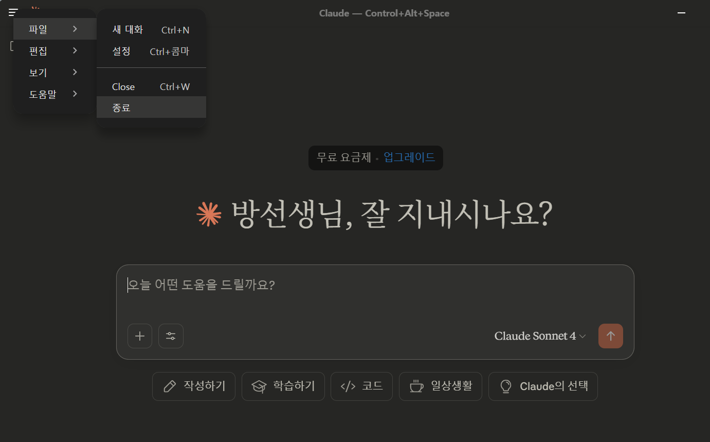 • Claude 데스크탑 접속 > 메뉴 > 파일 > 종료
