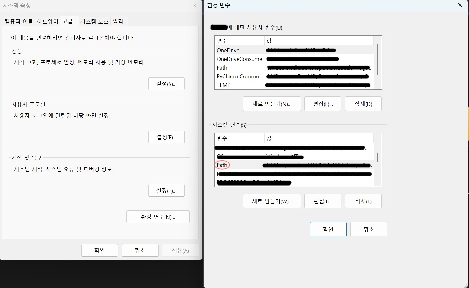 • 검색 > 시스템 환경변수 편집 > 고급 > 환경변수 > 시스템 변수 > path 더블 클릭 > 새로 만들기 > 아래 경로 2개 입력