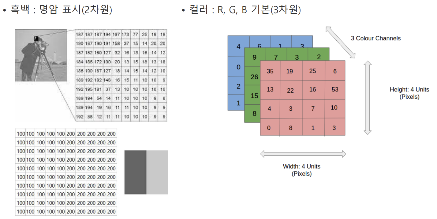 - 기본 단위 : 픽셀(pixel), 0~255 사이의 숫자로 존재