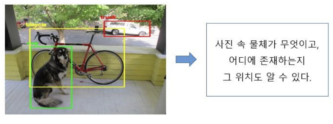 - 이미지 내의 물체가 무엇인지 분류해줄 뿐 아니라, 이미지 내에서 물체의 위치를 예측하여 바운딩 박스(Bounding Box)로 알려주는 task