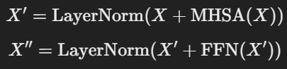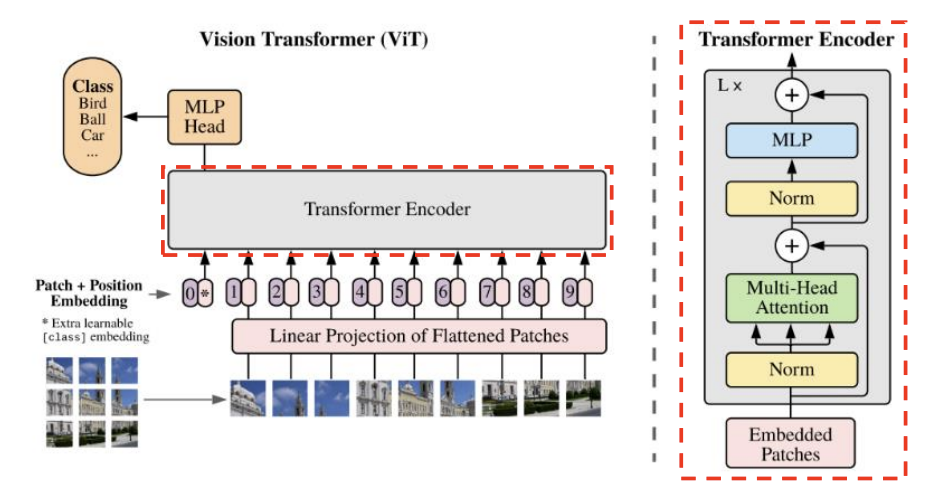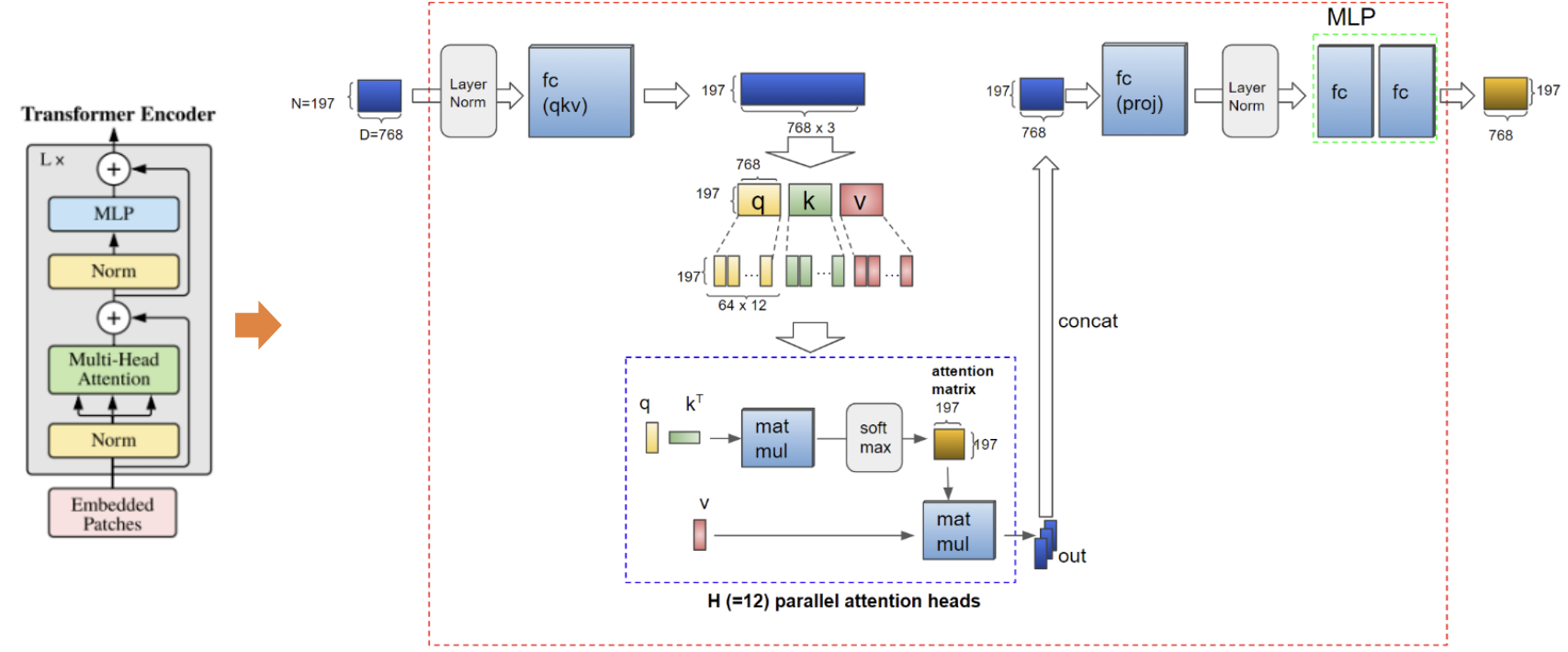 - ViT는 Transformer Encoder만 사용하며, Multi-Head Self-Attention (MHSA)과 Feed Forward Network (FFN)를 여러 번 반복하는 구조임