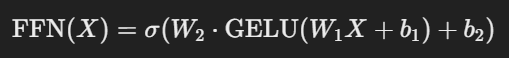 - 비선형성을 학습하기 위해 두 개의 완전연결층(Dense Layer)과 GELU 활성화 함수를 사용