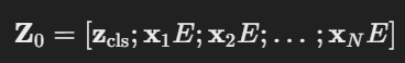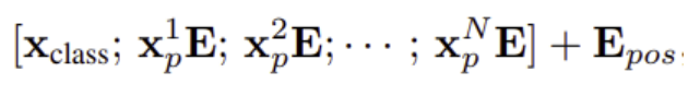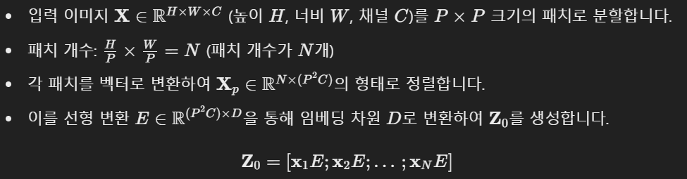 - 각 Patch를 학습 가능한 벡터로 변환 : 각 Patch()와 행렬 E()의 행렬 곱 연산