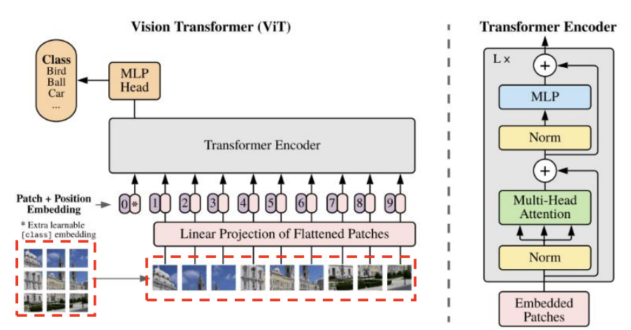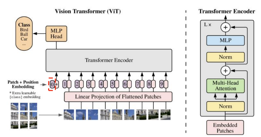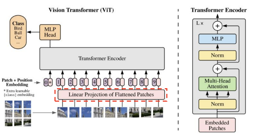 - ViT는 CNN처럼 전체 이미지에서 컨볼루션을 수행하는 것이 아니라, 이미지를 작은 패치(Patch) 단위로 잘라 이를 Transformer의 입력으로 사용함