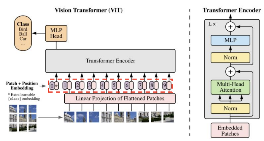 - Transformer는 CNN과 달리 위치 정보(Spatial Information)를 직접적으로 처리하지 않기 때문에, Patch Embedding의 Position 정보를 유지하기 위해 위치 임베딩(Positional Encoding, PE)을 추가함