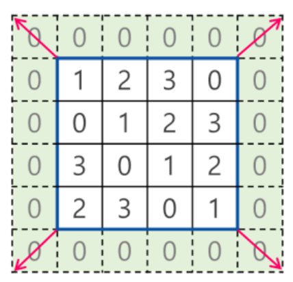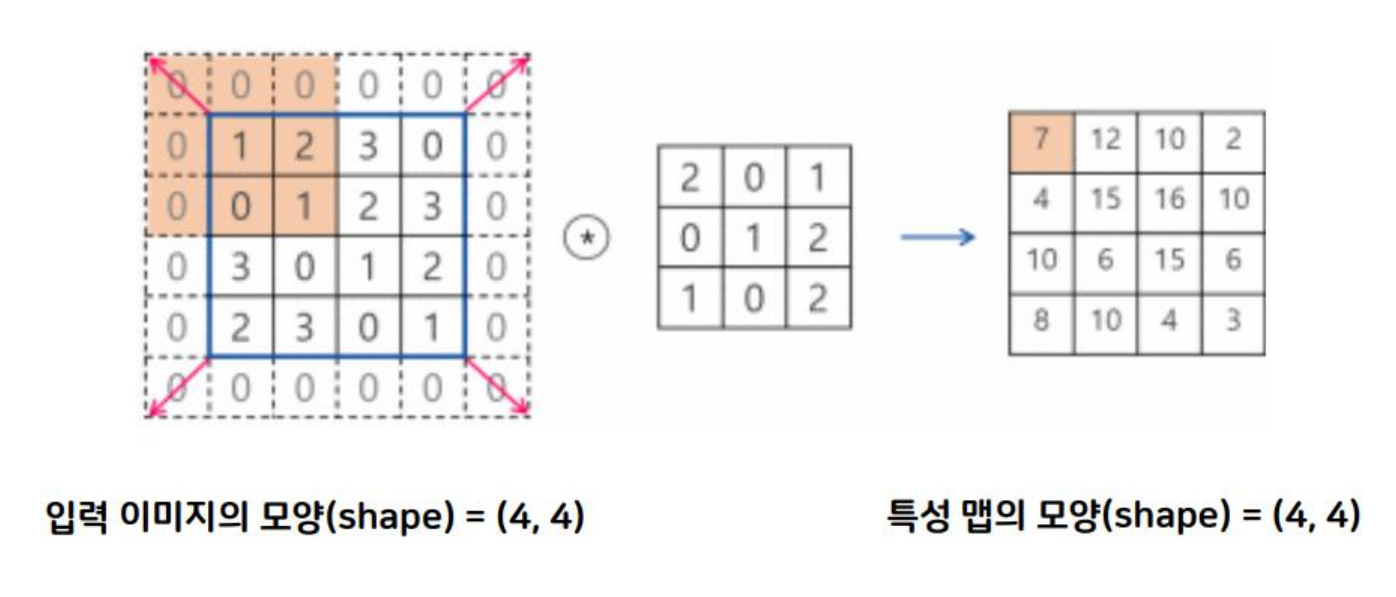 - 개념 : 합성곱 연산을 수행하기 전에 입력데이터 주변을 특정 값(주로 0)으로 채워 넣는 것
