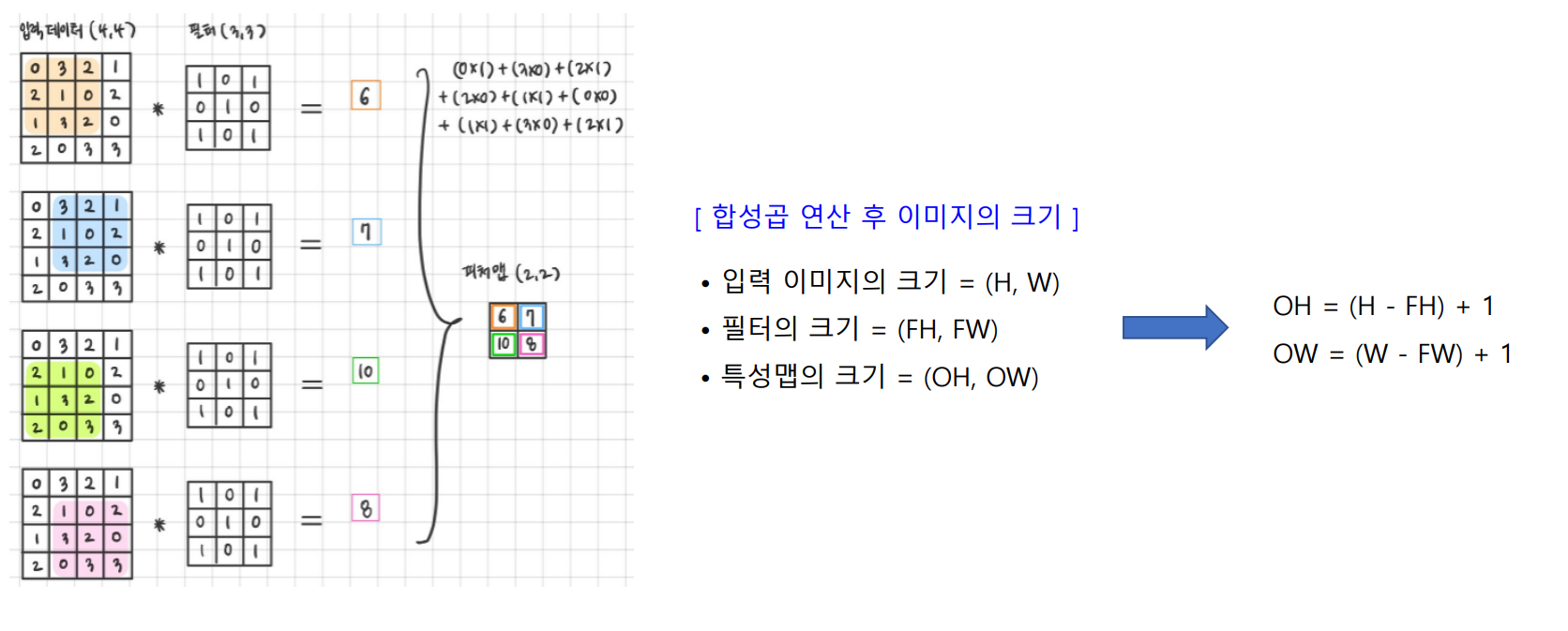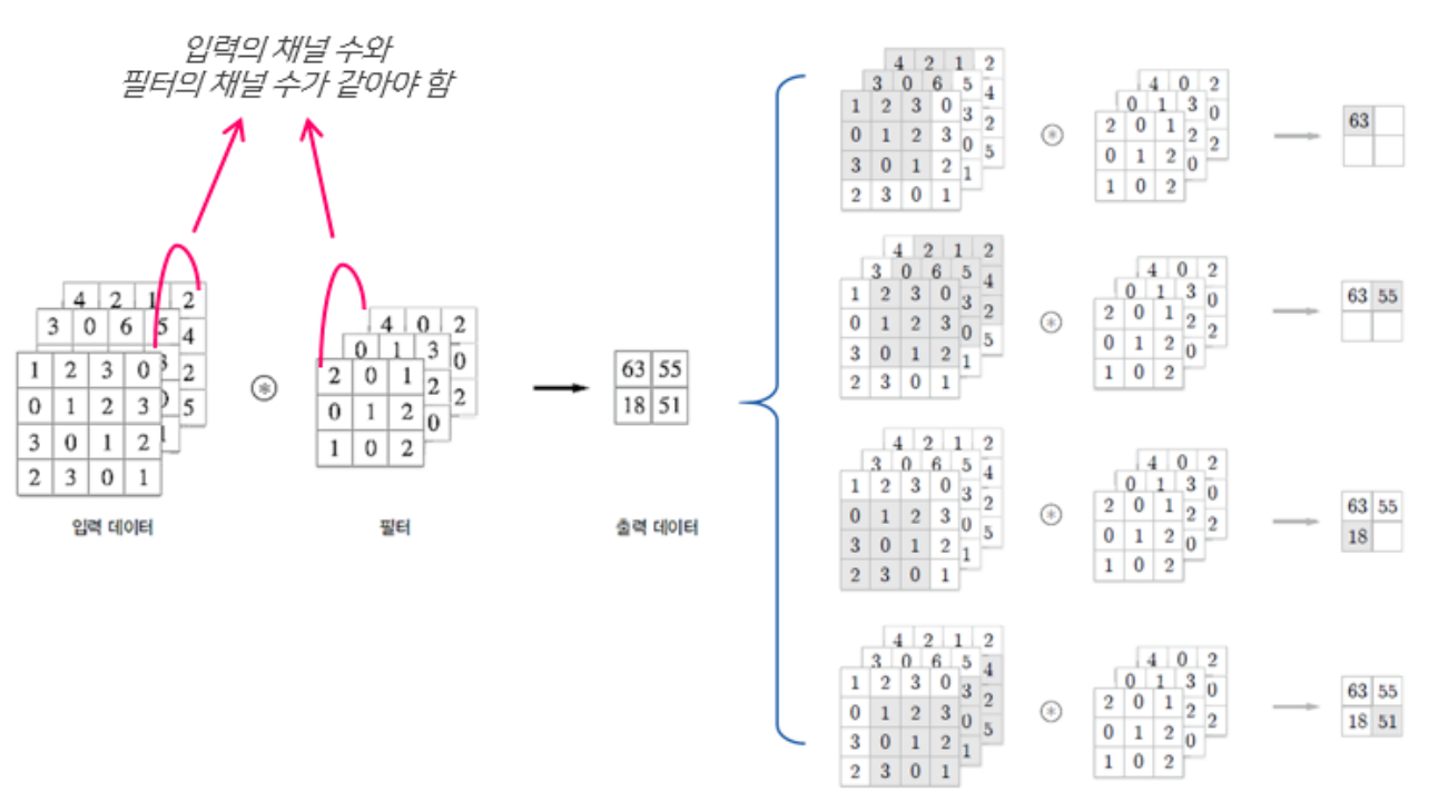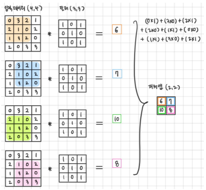 - 개념 : 필터를 일정한 간격으로 이동해 가면서, 입력 데이터와 필터에서 서로 대응되는 원소끼리 서로 곱한 후 그 값들을 모두 더해주는 연산