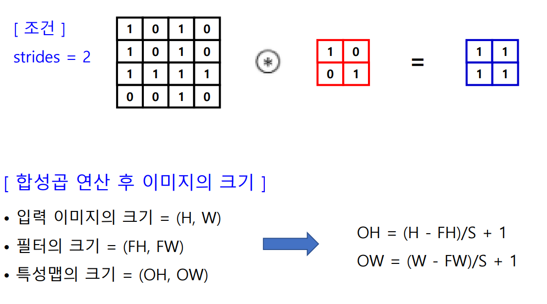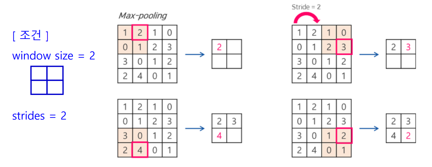 - 필터를 일정한 간격으로 이동 : strides (간격은 매개변수로 조절 가능)