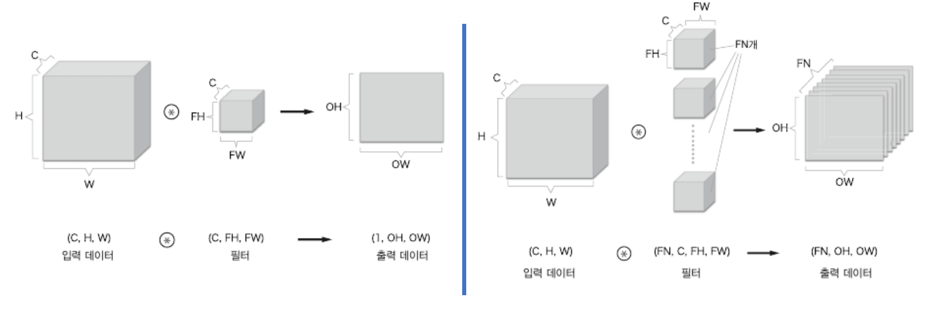 - 입력 데이터와 필터를 아래의 그림처럼 직육면체의 블록으로 생각하면 쉽다.