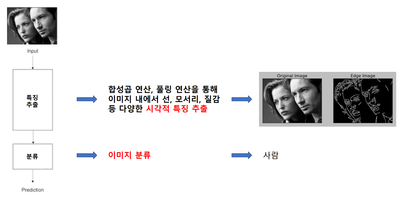 - 특징(feature) : 물체들을 구별할 수 있는 성질 예) 윤곽선, 귀의 모양, 얼굴의 형태
