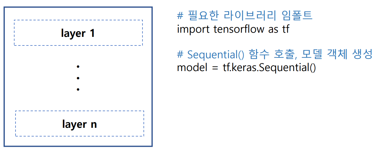 - Sequential() 함수 : 여러 개의 계층(layer)을 순차적으로 쌓을 수 있는 빈 껍질(컨테이너) 생성