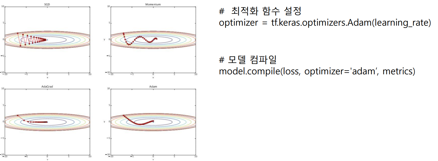 - 최적화 함수(optimizer) : 모델의 가중치를 업데이트하여 손실을 최소화하는 함수