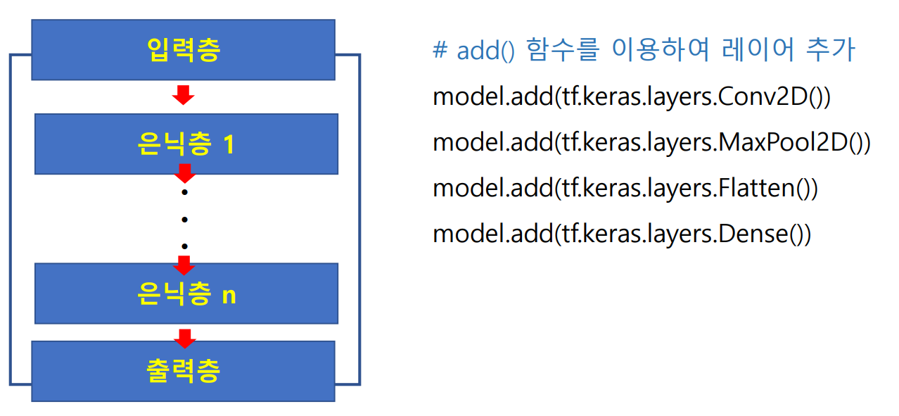 - add() 함수를 이용하여 레이어 추가 → model.add(매개변수 = layer)