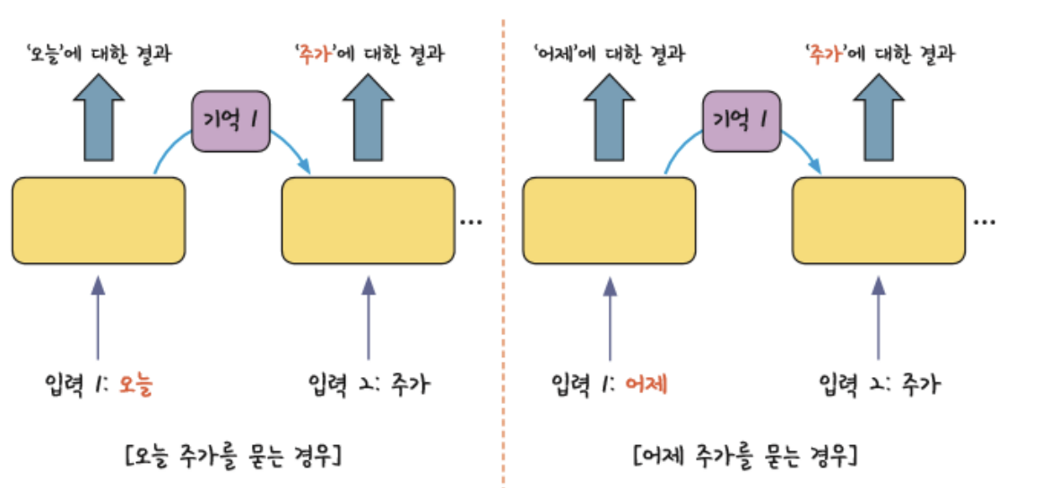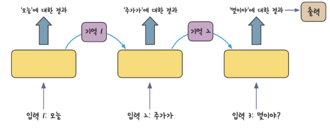 - 과거의 기억을 저장 : 여러 개의 데이터가 순서대로 입력되었을 때 앞서 입력 받은