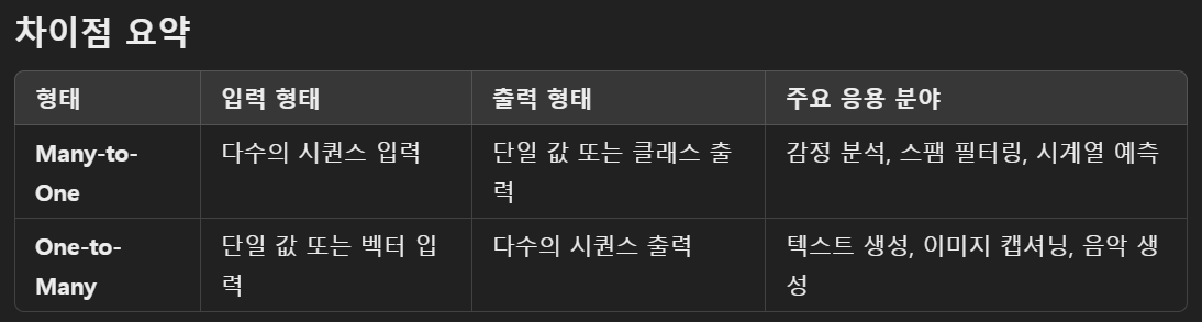 - 입력은 시퀀스 형태(시간 또는 순차적으로 연결된 데이터)이며, 출력은 하나의 값 또는 클래스임