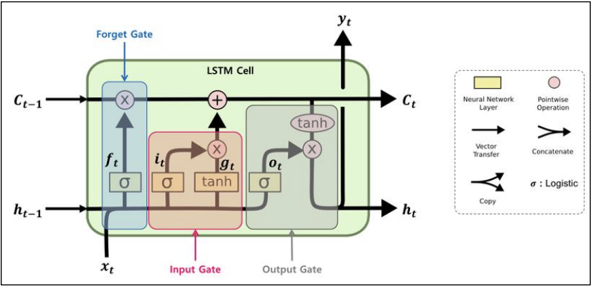- LSTM 1개는 3개의 gates(input, forget, output)로 구성