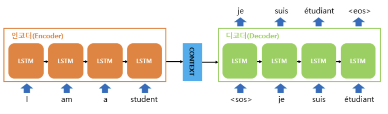 - 하나의 텍스트 문장이 입력으로 들어오면 하나의 텍스트 문장을 출력하는 구조, 생성 모델, 기계 번역에서 사용되는 모델