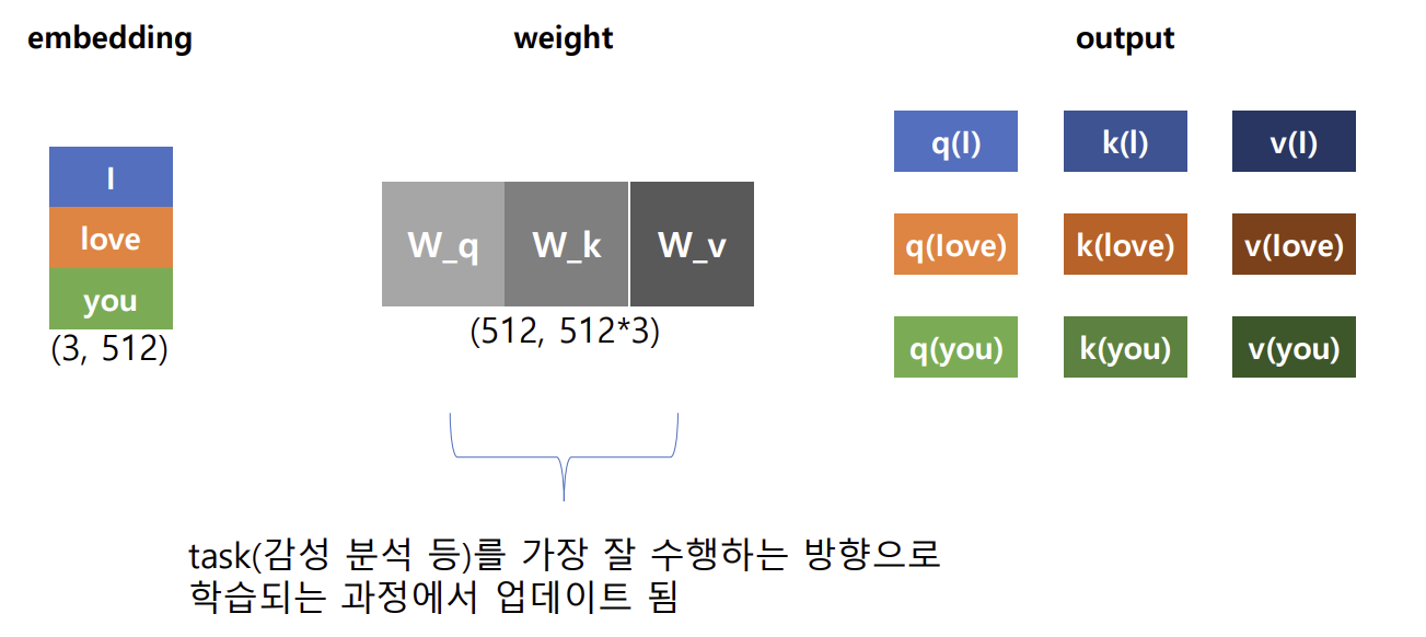 # 전체 단어의 임베딩 행렬과 가중치 행렬의 행렬 곱 --> 각 단어별 q, k, v 행령 생성