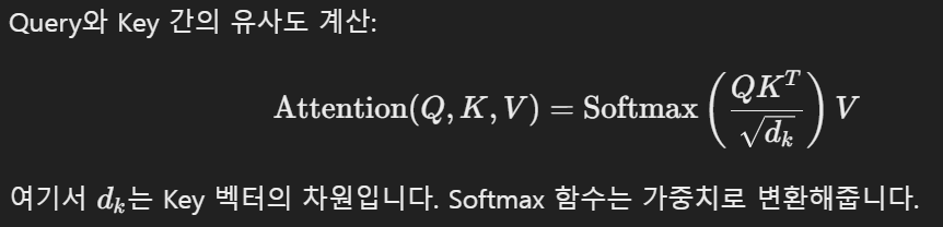 - 쿼리(Query), 키(Key), 값(Value) 벡터 간의 연산을 통해서 문맥적 관계성을 추출하는 과정