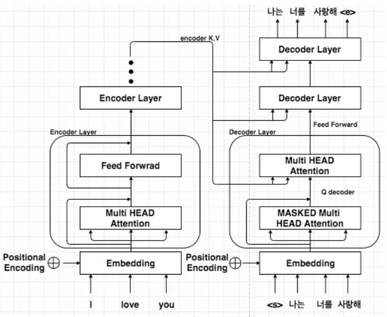 - Transformer 모델의 구조 : 인코더(encoder) + 디코더(decoder)