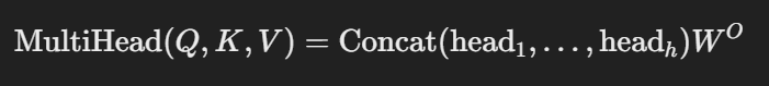 여기서 각 Head는 독립적으로 Self-Attention을 수행하고, 출력들은 연결되어 다시 선형 변환이 적용됨