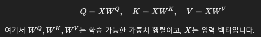 - 각 단어 임베딩 벡터 → 쿼리(Query), 키(Key), 값(Value) 벡터 생성