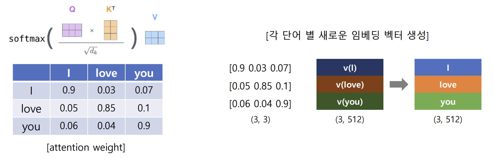 - 이 과정에서 각 단어는 다른 모든 단어들과의 관계를 반영한 새로운 벡터로 변환됨
