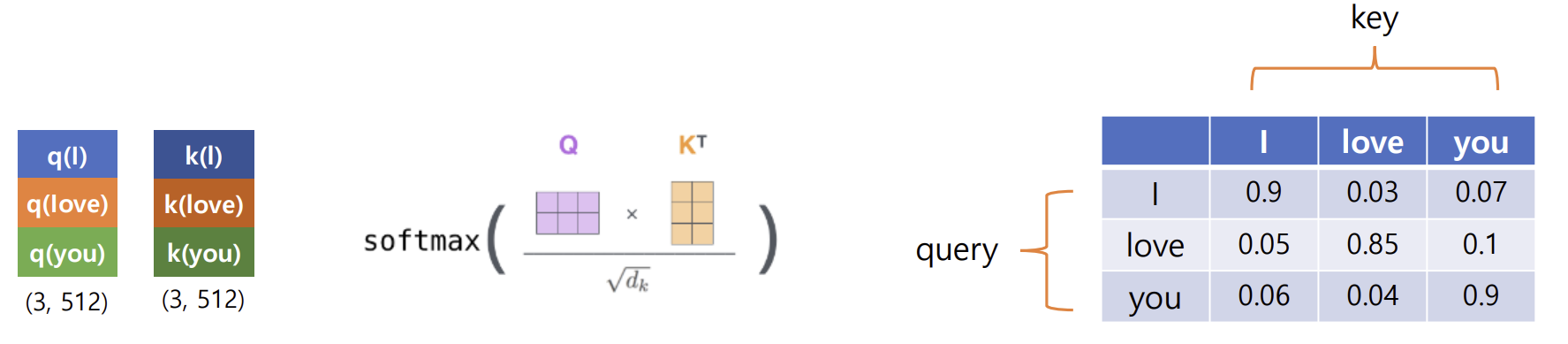- 각 Query와 Key 간의 유사도는 Softmax 함수를 통해 확률 값으로 변환됨 =>