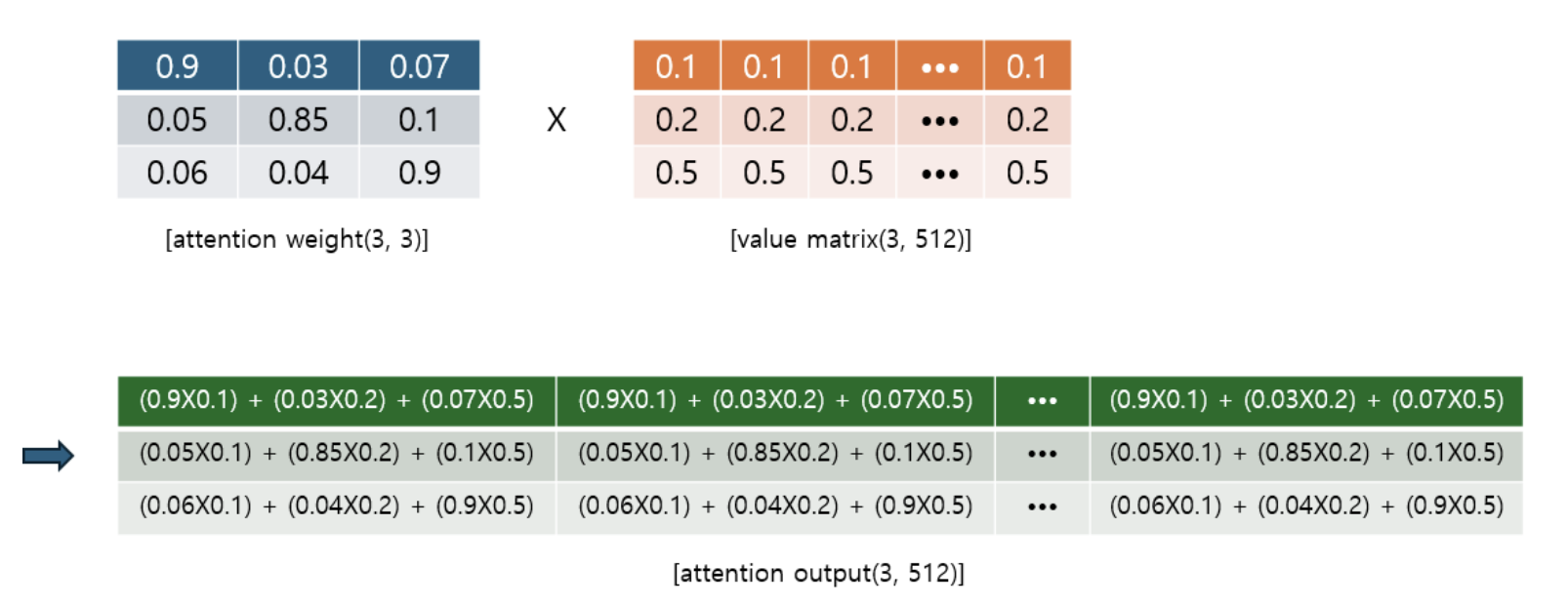 - 어텐션 가중치(attention weight)와 Value 벡터의 가중합 계산