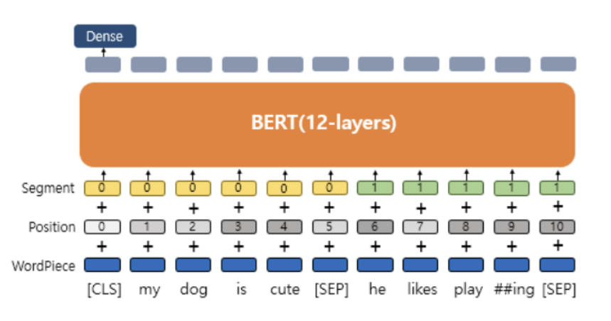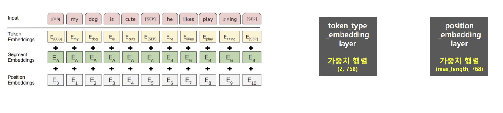 - Segment 임베딩 : 단어가 어떤 클래스(문장)에 해당하는지
