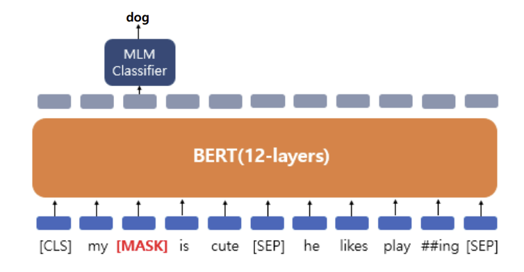 ex) My dog is cute → [‘My', 'dog', 'is’, 'cute’ ] → [ [CLS], ‘My’, [MASK], 'is’, 'cute’, [SEP] ]