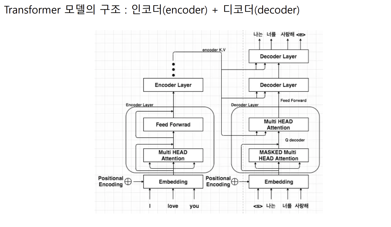 - self-attention → 문장을 구성하고 있는 각 단어 간의 관계를 반영한 새로운 단어 임베딩 벡터 생성