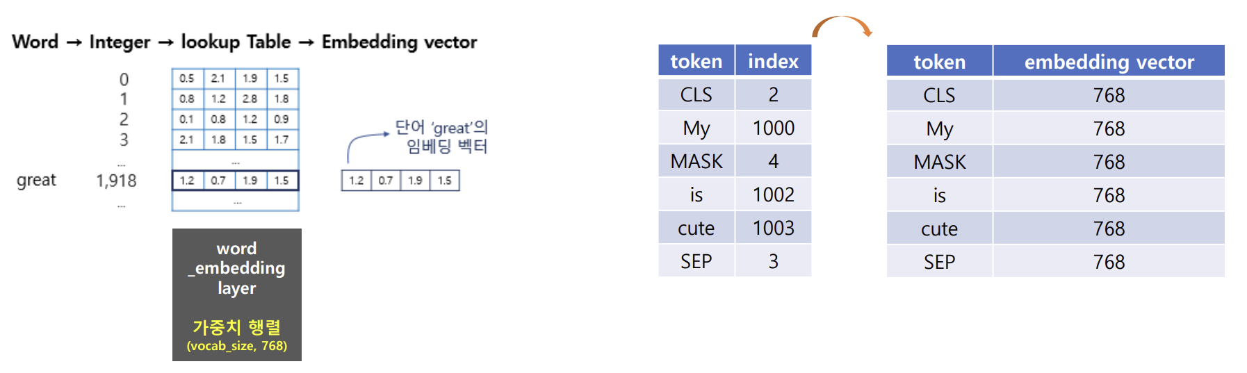 - 임베딩 벡터 size 768로 확장